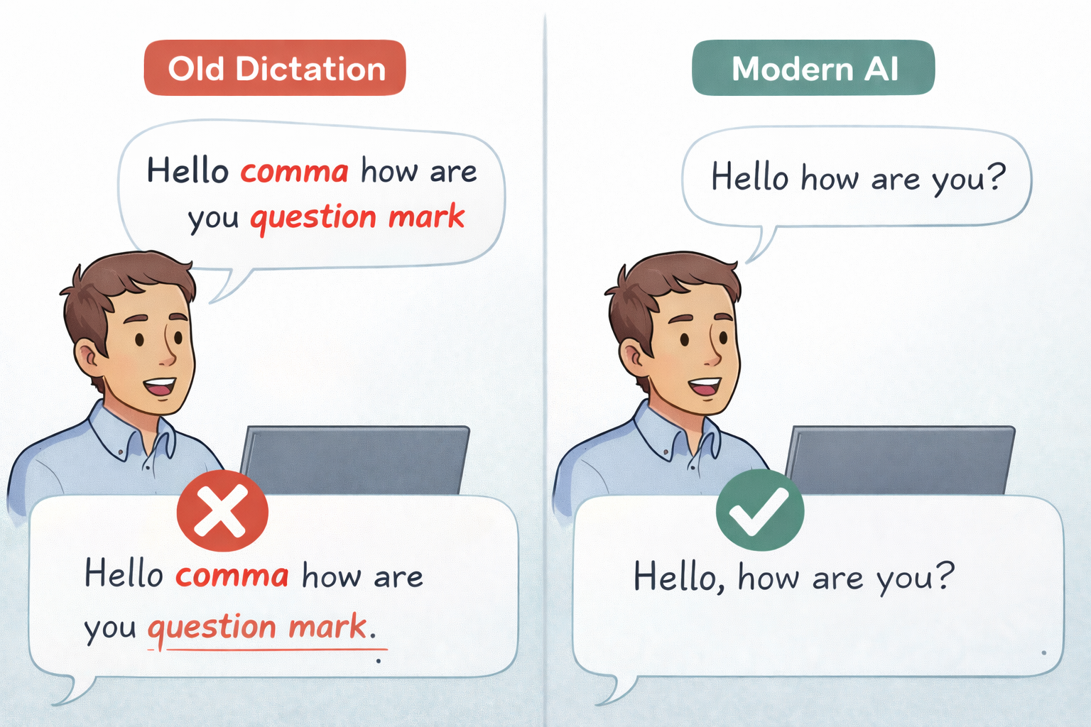 Uno de los mayores puntos de fricción con las herramientas antiguas era la puntuación. Para obtener un punto, decías "punto". Para obtener una coma, decías "coma". Eso rompía por completo el flujo natural del habla.